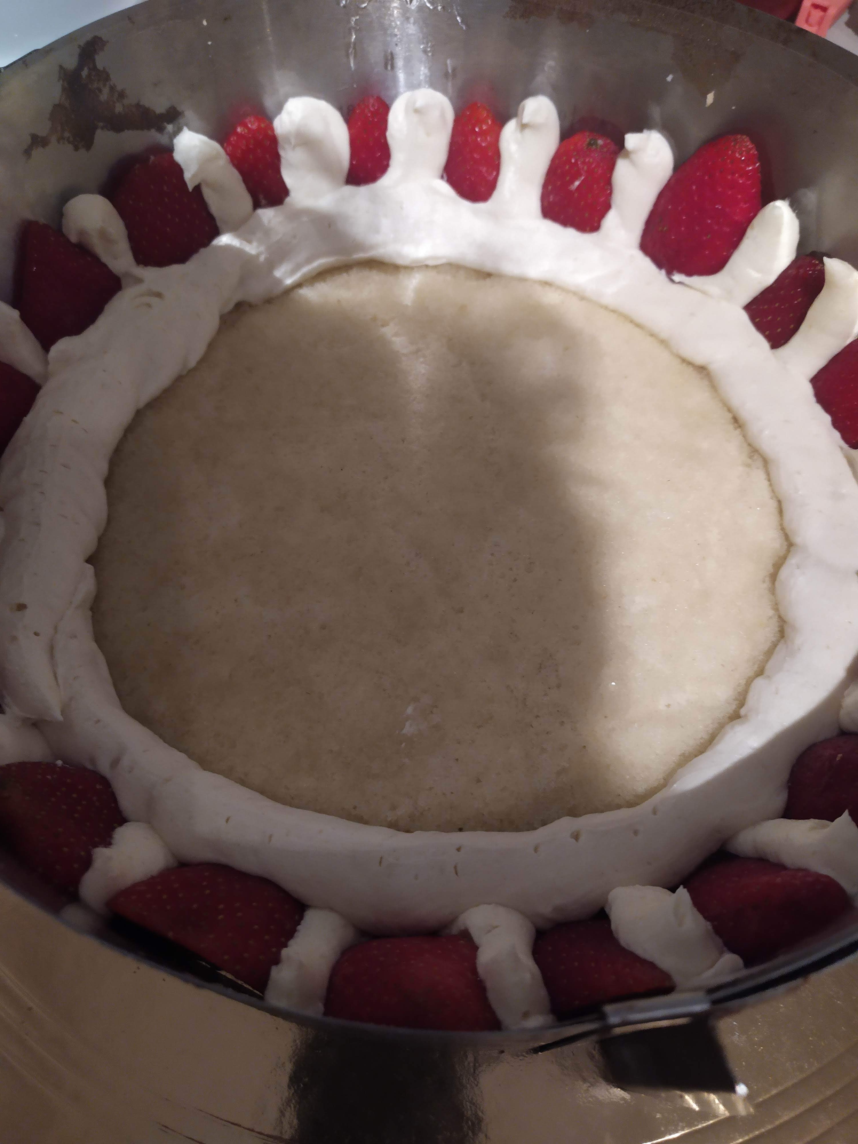 Prenez une poche à douille et mettre de la crème entre vos fraises bien partout, puis tout autour du biscuit, et ensuite sur tout le bord du moule jusqu’en haut du moule , puis dans le centre mais pas jusqu’en haut.