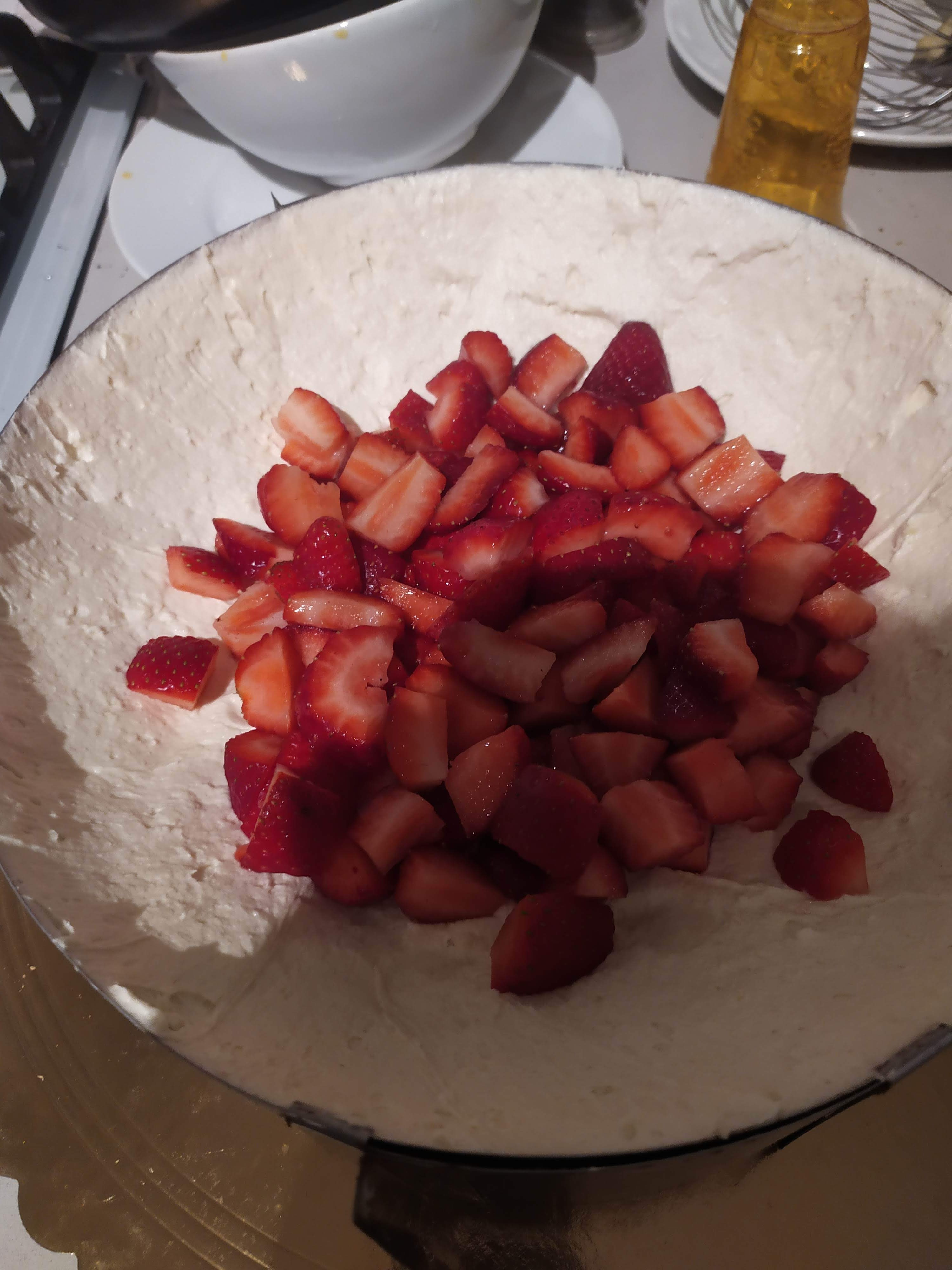Mettre pleins de morceaux de fraises par-dessus bien a milieu et recouvrir de crème, jusqu’à presque le haut du moule (pensez qu’il y aura un deuxième biscuit par-dessus et qu’à ce moment là, vous devez être en haut de votre moule.