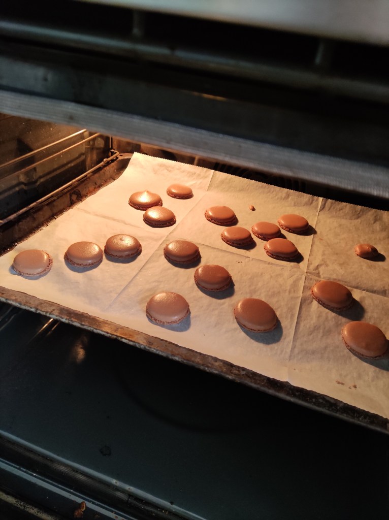 Une autre astuce est de lever votre plateau à environ 10 cm de votre plan de travail et le lâcher pour faire remonter les bulles d’air 1 ou 2 fois avant de faire crouter les macarons !