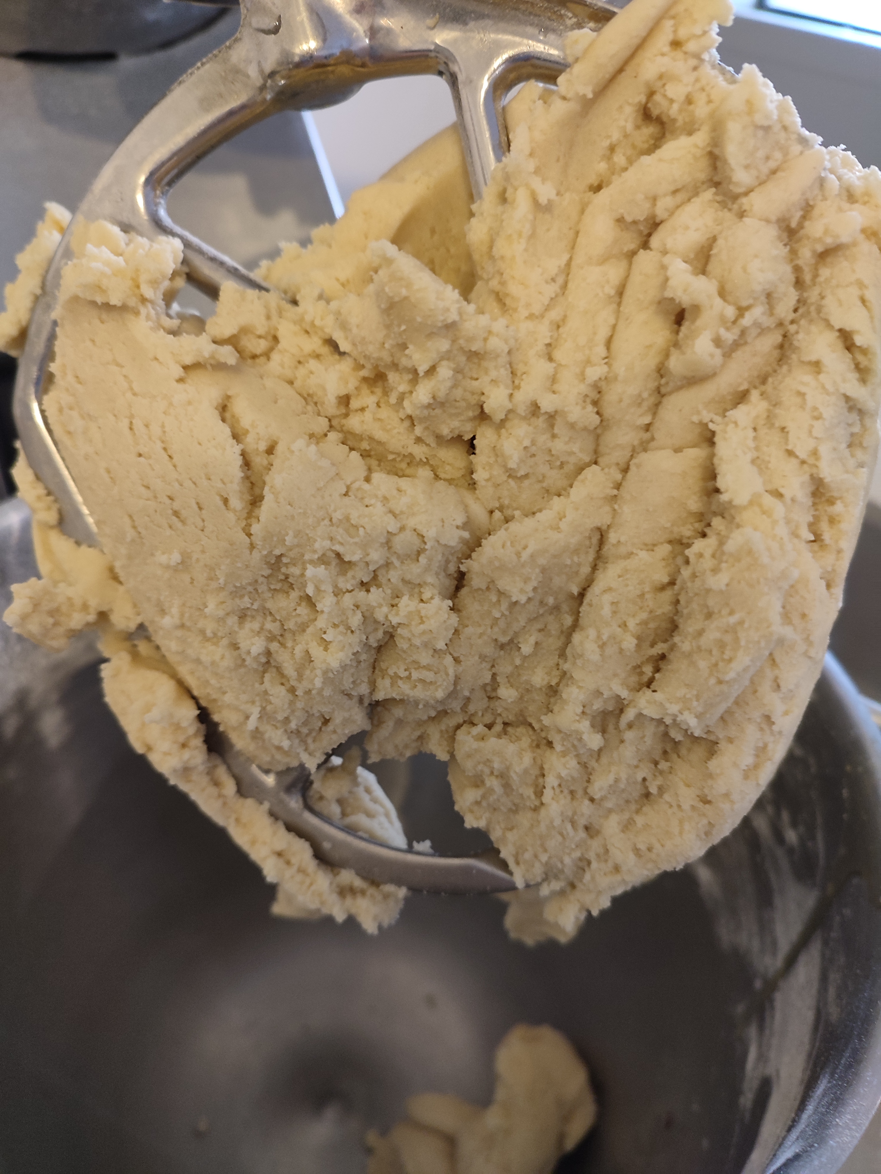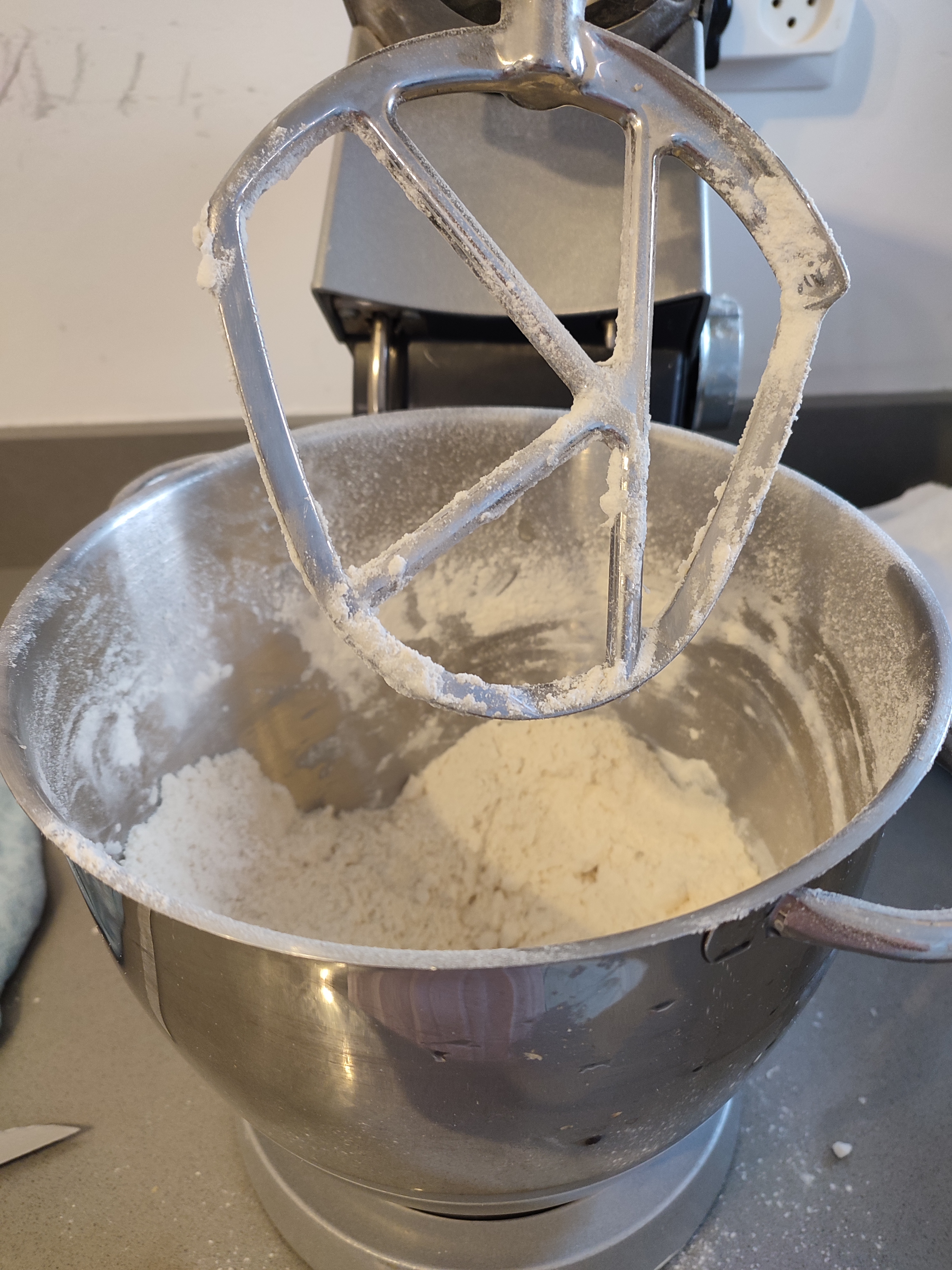 Dans la cuve (froide) de votre robot, mettez la farine, le sucre glace, le sucre vanillé, et la margarine (bien froide) coupée en petit cube. Mélanger avec la feuille (le K du Kenwood).