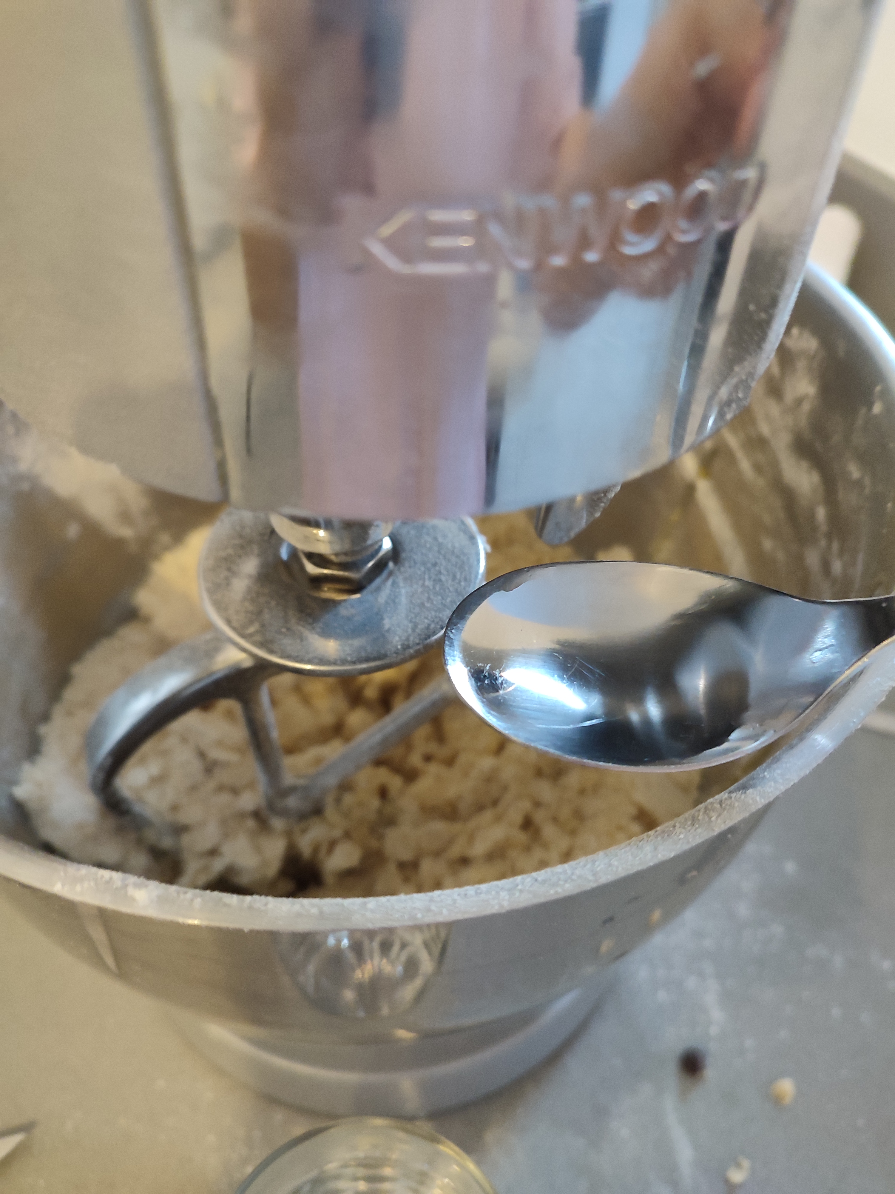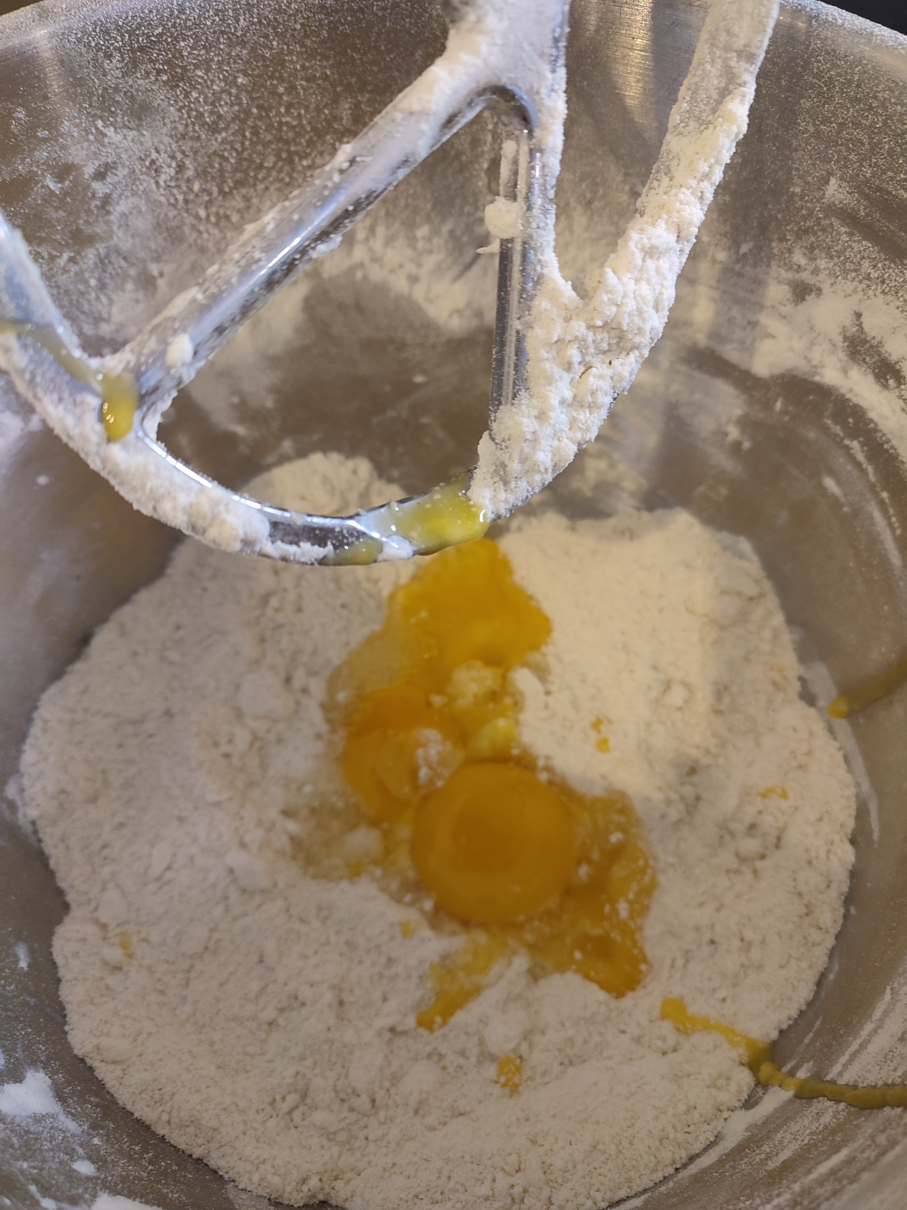 Ajouter l’œuf et le jaune d’œuf dans la cuve puis continuer de mélanger. Pendant que le robot mélange rajouter vos trois petites cuillère à soupe d’eau très froide ! Vous verrez une boule de pâte se former dans votre cuve ! C’est que vous avez réussit votre pâte !