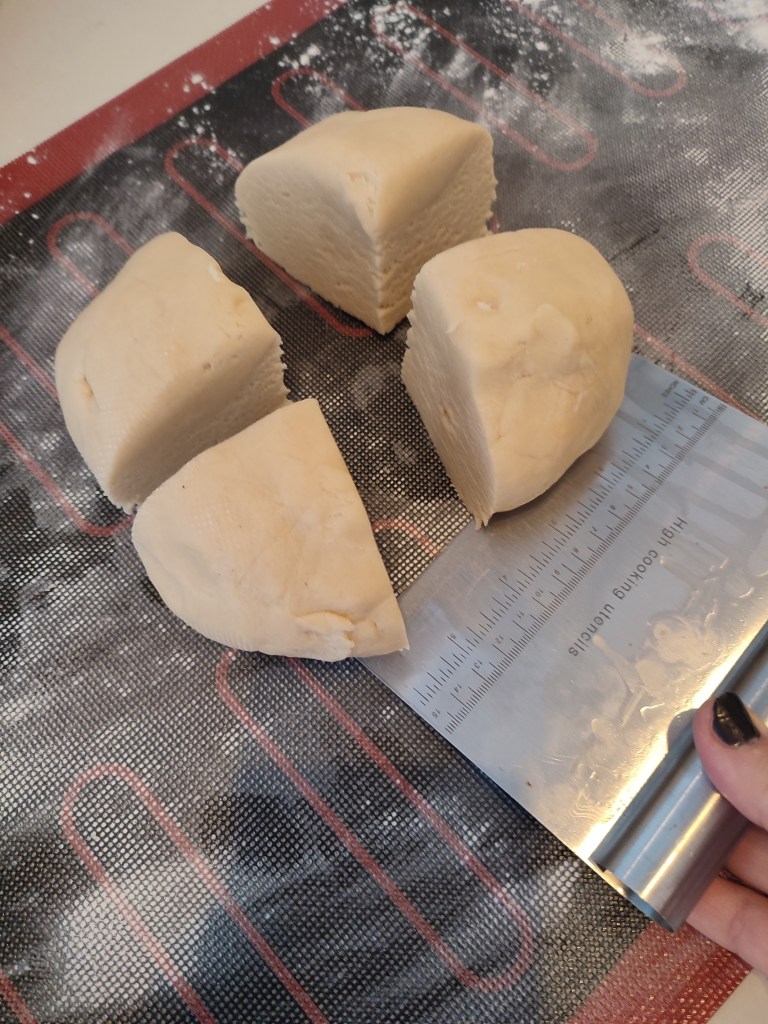 D’ailleurs quand j’ai terminé de préparer ma pate et après l’avoir laissé reposer au frais une première fois, je la coupe en 4 morceaux et je réserve les 3 que je n’utilise pas au frais pendant que je m’occupe du quatrième morceau etc.…