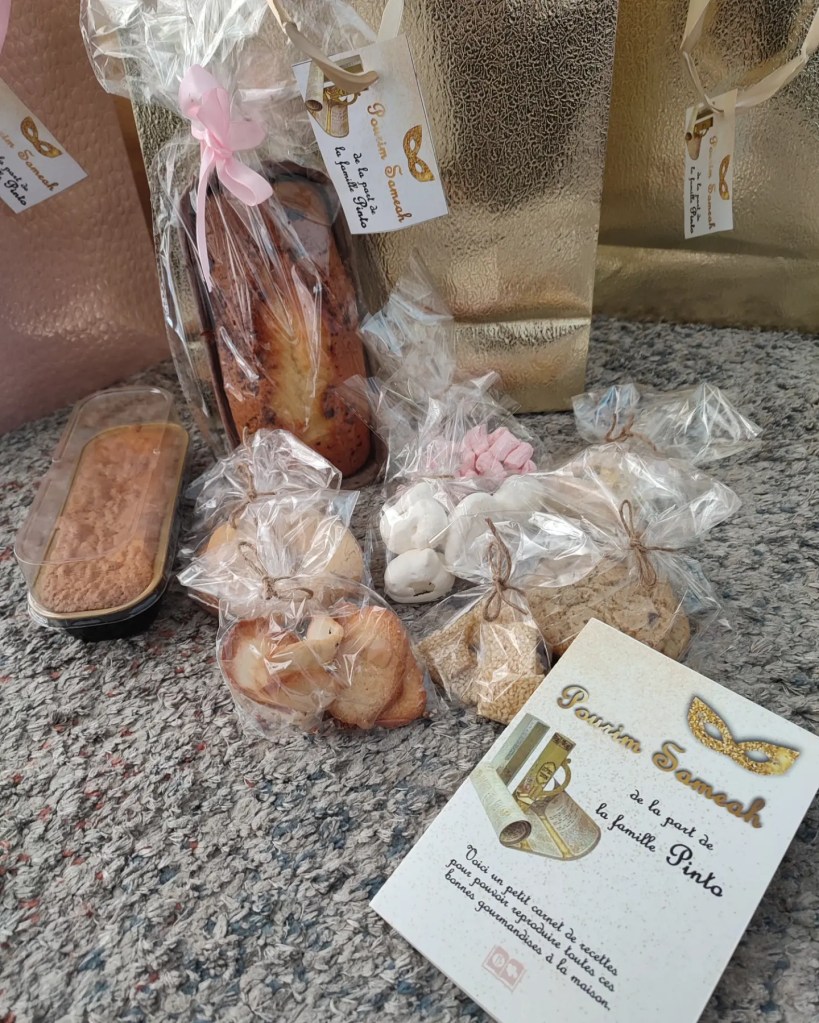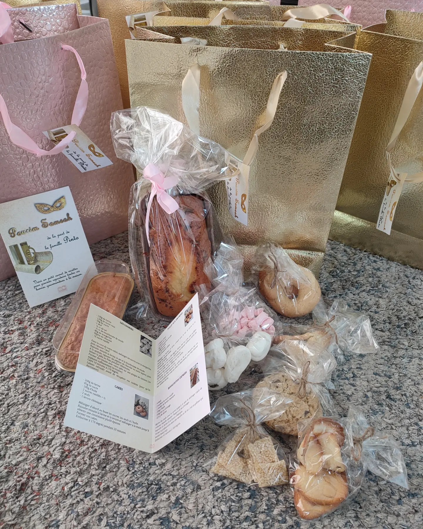 Cette année j’en ai fais 25 ! Ils étaient tous composer de 7 préparations maisons, puis j’y ai glissé également un petit paquet de bonbon style guimauve rose et blanc pour apporter encore plus de douceur et de gourmandise…