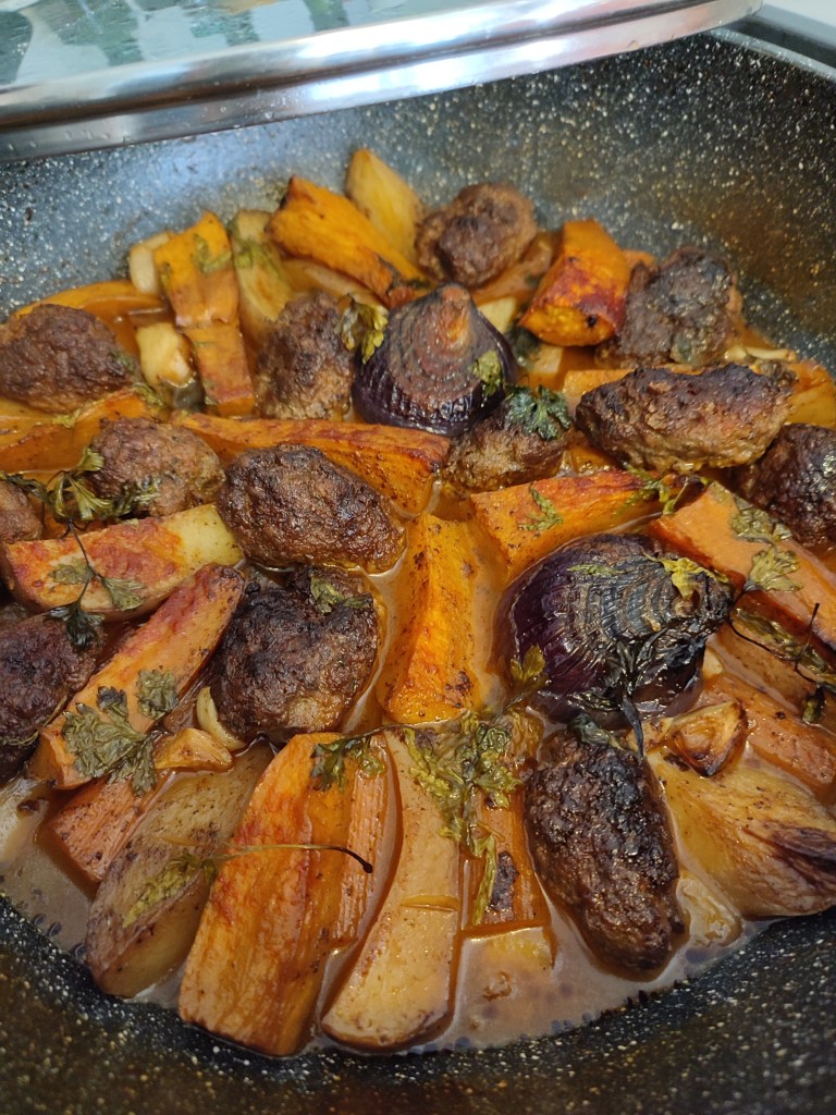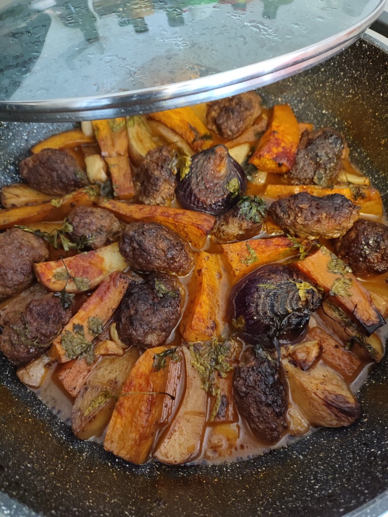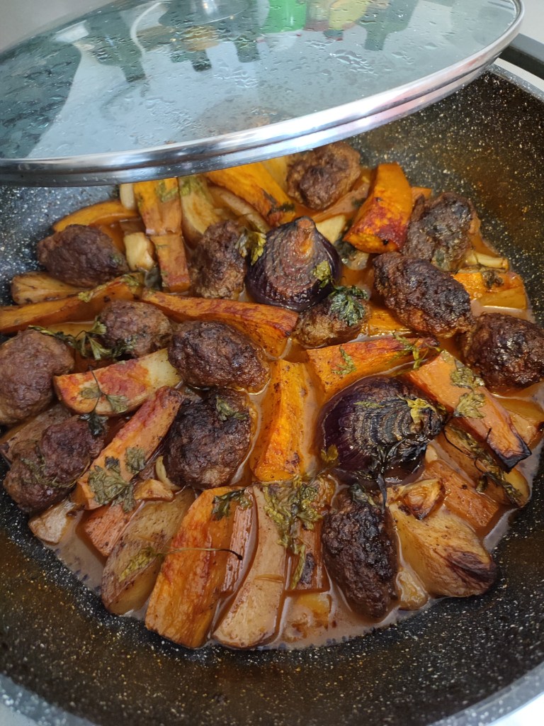 Retirer vos boulettes de la casserole , puis commencer à disposer vos ingrédients dans la casserole de manière jolie : une tranche de pomme de terre puis une tranche de carotte, puis une tranche de patate douce etc … Disposer ensuite vos boulettes puis 2 oignons violet entier sans la peau. Rajouter un grand filet de miel de date , puis de l’eau jusqu’à mi hauteur des ingrédients .