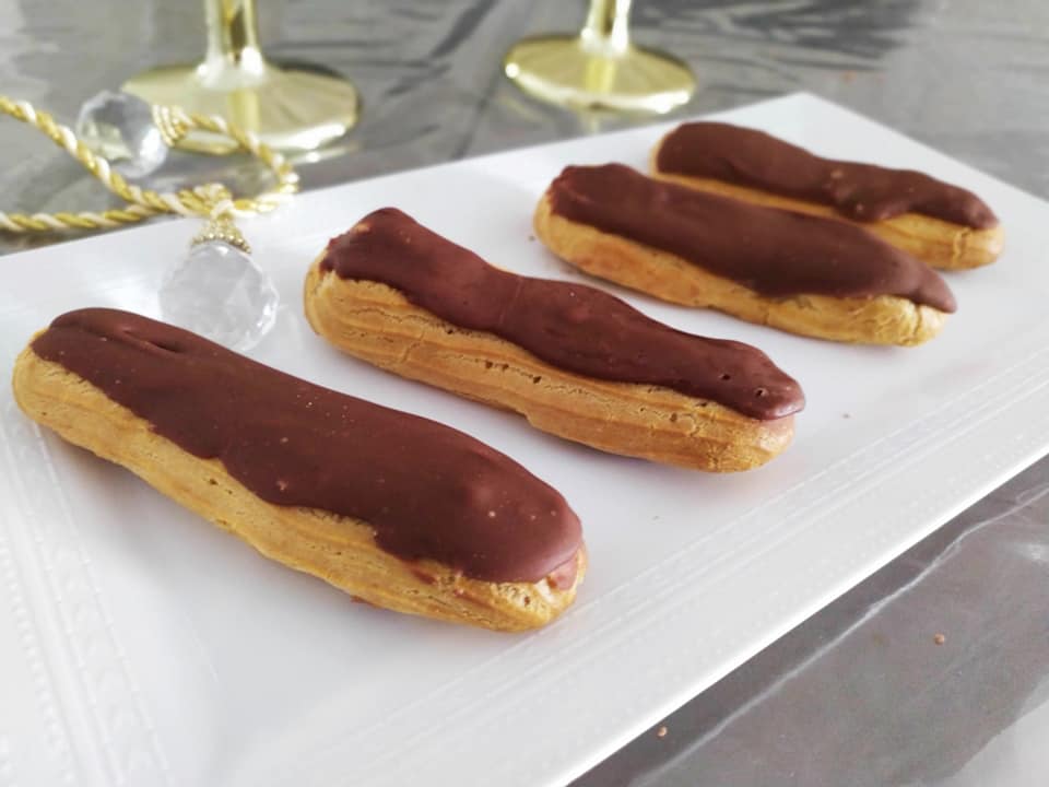 Pour glacer l’éclair je prends une spatule ou une cuillère et je fais couler le fondant sur mes éclairs. Pour les débutantes, vous pouvez mettre votre éclair face à glacer dans l’assiette quelques secondes et retirer l’excédent !