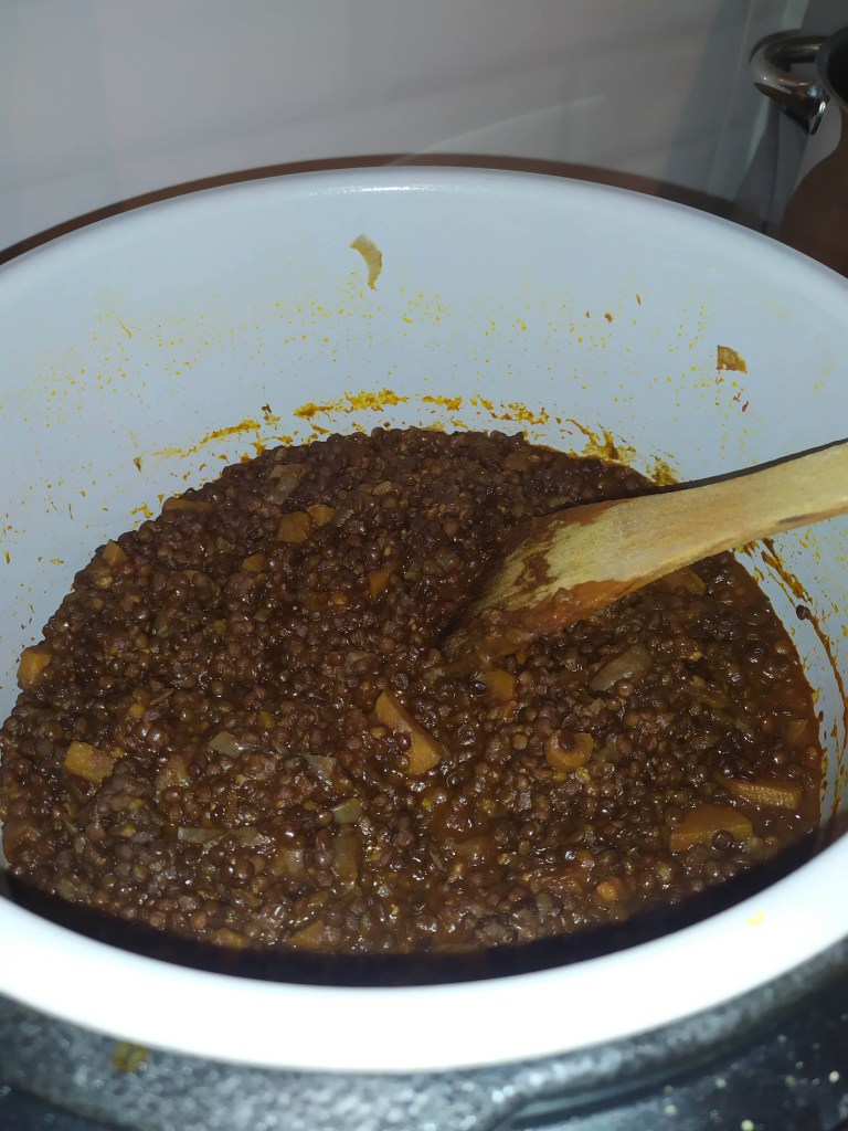 Faite revenir votre oignon dans la cuve de votre ninja jusqu’à ce qu’il commence à devenir translucide, ajouter ensuite le concentré de tomate, 2 cs d’ail écrasé, les épices sauf le sel, puis les lentilles. Mélanger quelques secondes. Enfin rajouter de l’eau environ 750 grammes. Rajouter un peu de sel.