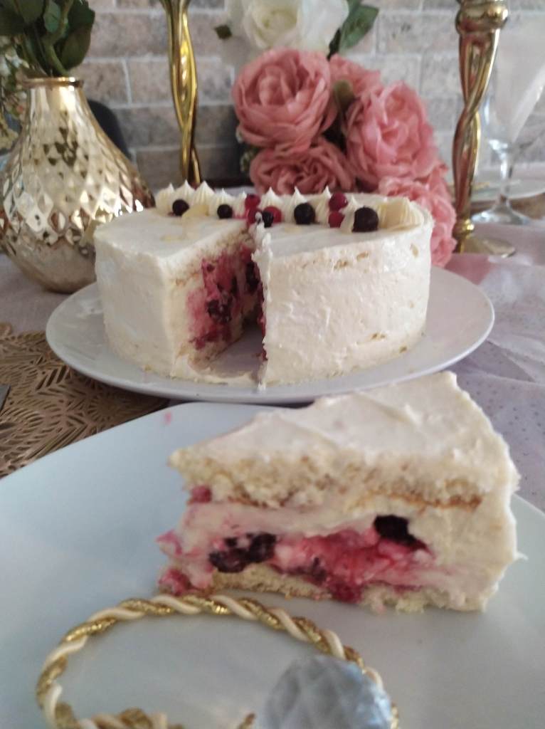 Je finis par mettre le reste de ma crème par-dessus le biscuit. C’est finit ! Je mets au frais quelques heures avant de démouler et éventuellement décorer avec quelques framboises ou quelques fruits rouges !